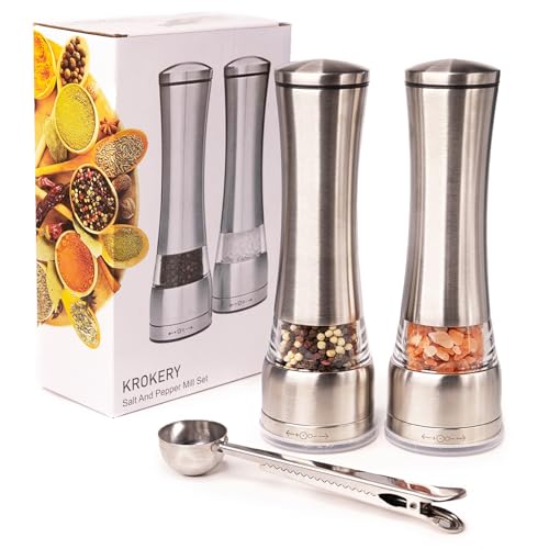 Krokery Salt and Pepper Grinder Set is made of stainless steel, clear acrylic and ceramic core. Easy to refill and adjust coarseness.