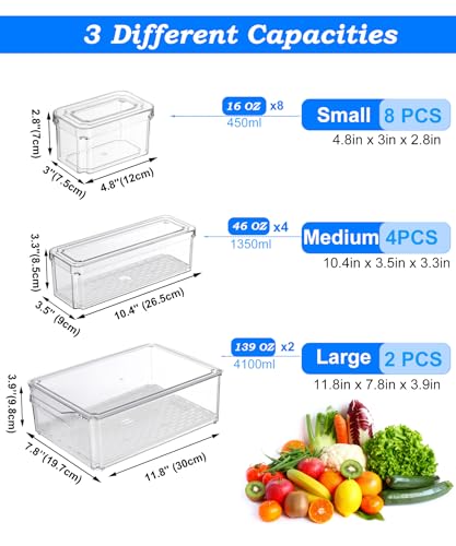 - 𝟏𝟒 𝐏𝐚𝐜𝐤 𝐅𝐫𝐢𝐝𝐠𝐞 𝐒𝐭𝐨𝐫𝐚𝐠𝐞: The food storage containers for fridge come in 3 different sizes(2 large size 139 oz, 4 medium sizes 46 oz, and 8 small sizes 16 oz) to make full use of all the space of refrigerators & kitchen cabinets. Also plastic fridge storage containers with an easy-grip side handle allows you to move it with easy