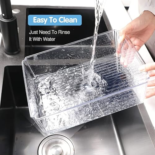 - 𝐃𝐫𝐚𝐢𝐧 𝐓𝐫𝐚𝐲 𝐃𝐞𝐬𝐢𝐠𝐧: Our 14 pack refrigerator organiser bins come with a unique tray and dripping hole design at the bottom. This design helps to keep produce elevated and away from moisture, making it possible to store directly after cleaning. It is an effective way to keep food fresh while also extending the shelf life of food in the fridge