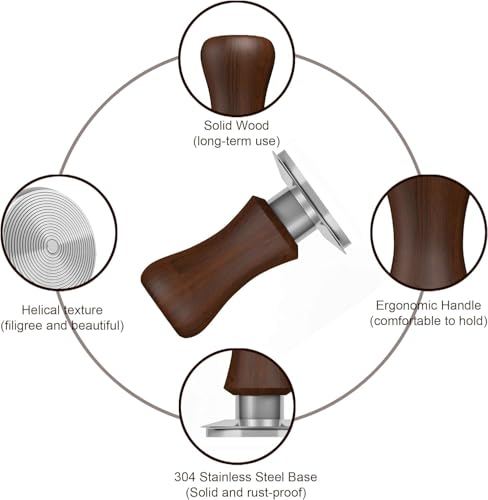 - ☕Ergonomic design – The coffee tamper features an ergonomic cuibourtia wooden handle, meticulously curved at the top for a safe and comfortable grip, reducing strain on your wrists and enhancing your compacting experience.