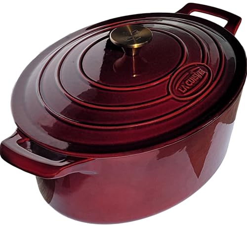 La Cuisine Enamelled Cast Iron Oval Casserole Pot Dutch oven 5 Liters, Internal Matt Black Enamel Coating, Cranberry Enamel Coating Exterior, Gold-Plated Stainless Steel Lid Handle, Oven Safe
