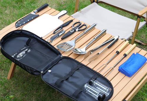 - 【What you will get】Include Tongs, Multi-function Scissors, Knife , Spoon, Spatula, Peeler, Chopping Board, Cleaning Cloth, BBQ Skewer, 2-in-1 Bottle Opener, Spice Bottle and Storage Bag.