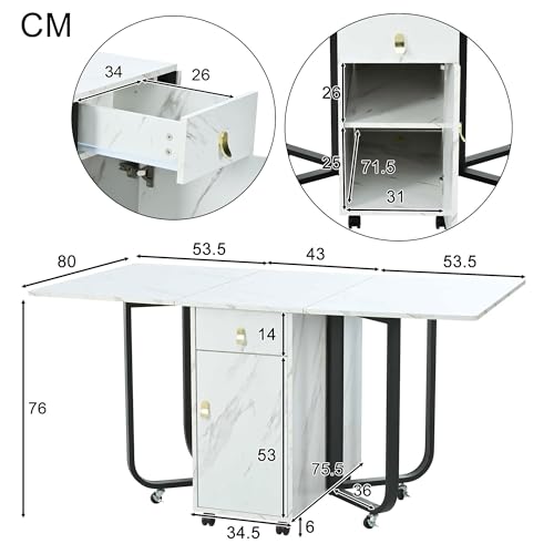 LANTRO JS Extendable Dining Table, Space Saving Kitchen Table with Drawer and Cabinet, Drop Leaf Table with Supporting Legs with Castors, 43-150x80cm, White and Black