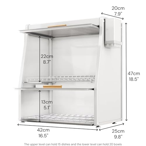 Large Capacity Dish Drying Rack with Lid, 3-Tier Freestanding Kitchen Drain Rack with Side Storage, Countertop Dish Organizer for Home & Restaurant (White)