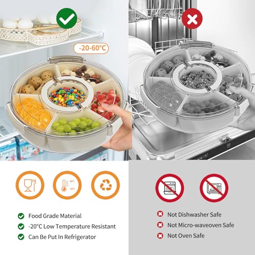 Leerweii Divided Serving Tray with Lid and Handle, Rotating Snack Box with 6 Compartments Snack Tray Round Portable Food Storage Divided Platter for Fruit Veggie Candy Spice