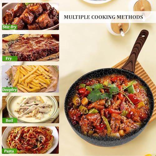 - Induction Base Stir Frying Pan—The nonstick coating is PFOA and PFOS free; you can prepare healthy dishes with minimal usages of oil, so the meals will be healthier yet delicious for you and your family. Perfect for deep-frying, sautéing, stir-frying, steaming, among others. This is excellent for quick meals to gourmet dishes.
