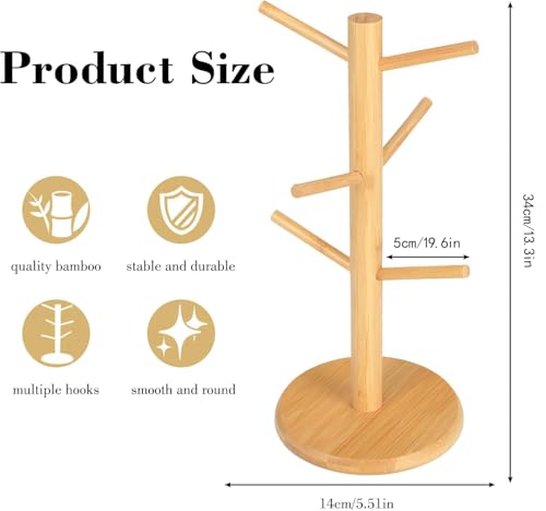 LIUQOBN (Height 34cm) 6 Cup Wooden Mug Tree,Mug Holder for Coffee & Tea Cups,Multi-Function Storage Rack with Anti-Slip Weighted Base for Coffee Tea Mugs Cups Jewelry Display