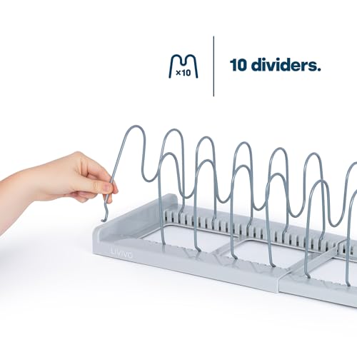 LIVIVO Expandable Pan Lid Organiser Rack Holder – 10 Adjustable Dividers – Non Slip Feet – Perfect For Pots, Pans, Chopping Board, Baking Trays – Kitchen Drawer Cupboard Organiser
