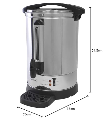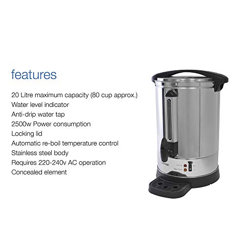 - 20 LITRE CAPACITY (APPROX. 80 CUP): The large 20L capacity makes approximately 80 cups, providing customers, guests and employees with hot drinks quickly and effortlessly when they need it with no mess. The catering urn is made from high quality stainless steel in an elegant, simple design and makes an excellent addition to any domestic or commercial kitchen. Design includes handy water level gauge, carry handle, anti-drip tap, concealed element, drip tray and locking twist lid.