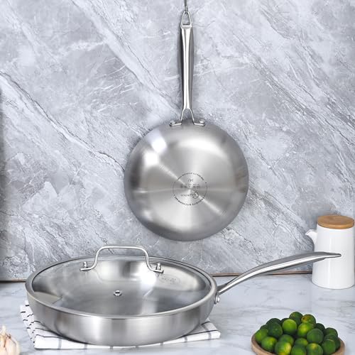 LOLYKITCH 8.5-10 Inch Tri-ply Stainless Steel Frying Pan Set with Lid,Skillets,Induction Cookware,Dishwasher and Oven Safe