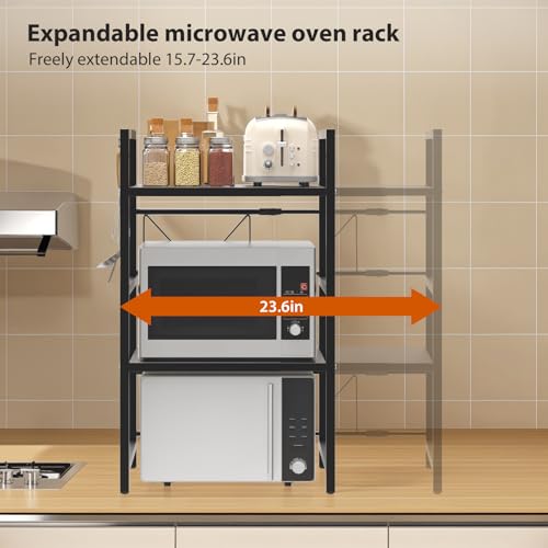 Lucn Expandable 3-Tier Microwave Oven Rack – Adjustable Kitchen Corner Shelf with 6 Hooks for Maximum Storage