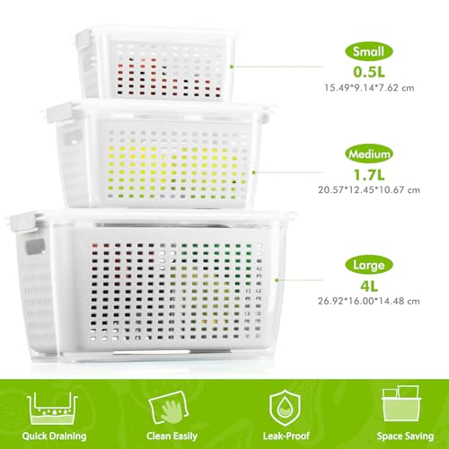 Luxear Fresh Food Storage Containers for Fridge, 3 Pack Vegetable Fruit Storage Container 4L+1.7L+0.5L Dishwasher Safe Produce Saver with Vents, Microwave Safe Food Organizer