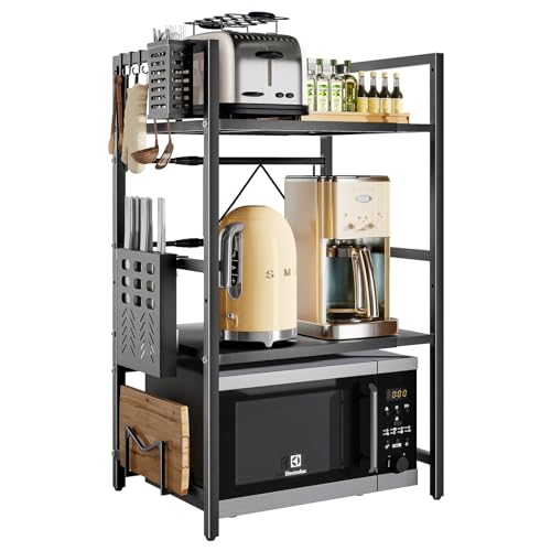 LZNIOZ Microwave Shelf with Hooks/Cutting Board Holder/Knife Holder/Cutlery Box, Microwave Stand for Kitchen Counter (Black)