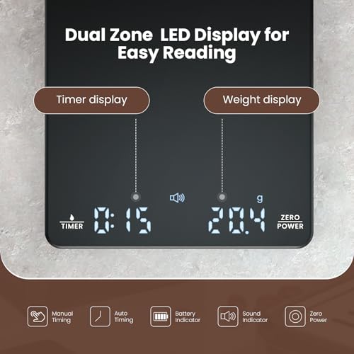 - 【Three Units & Two Modes】The Espresso Digital Timer Scale has three units of measurement (g/oz/ml) that can be converted at any time. The small coffee scale has two built-in timing modes, automatic and manual, allowing you to time the coffee brewing process accurately. This feature ensures that your coffee is always delicious and perfectly brewed to your taste
