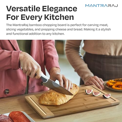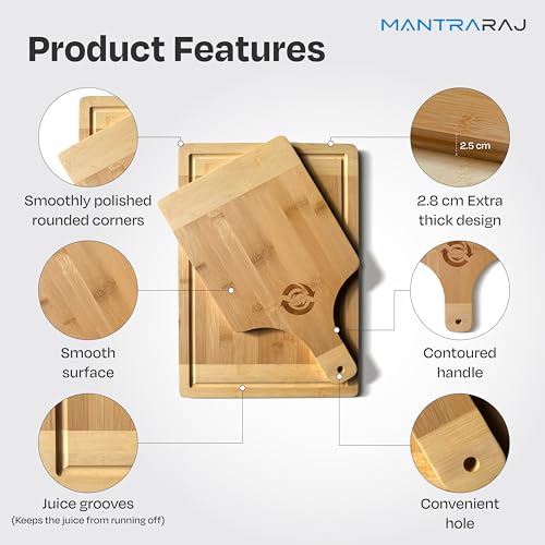 MantraRaj Combo (38x25cm) Bamboo,(20x35cm) Paddle Pizza Wooden Chopping Board Multi-Purpose Bamboo Cutting Board with Juice Groove for Carving Meat, Vegetables, Cheese and Bread for Any Kitchen