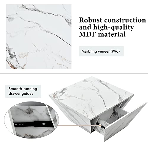 Marbling Veneer (PVC)Coffee Table Tea Table for Living Room, Large Side Table with 2 Cabinet, Square Side Table Console Sofa Table with Storage 70 * 70 * 36cm (White)