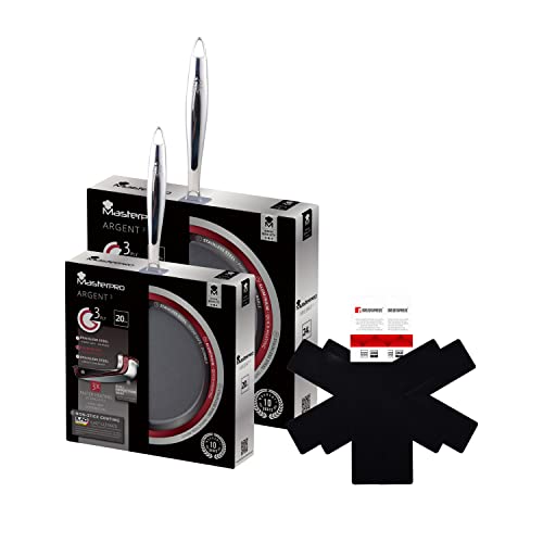 MasterPro Argent 3 Set of 2 Frying Pans 20 and 28 cm and Set of 2 Protectors, Stainless Steel, Non-Stick Triple Layer, Ergonomic Handles, No PFOA No LEAD no CADMIO