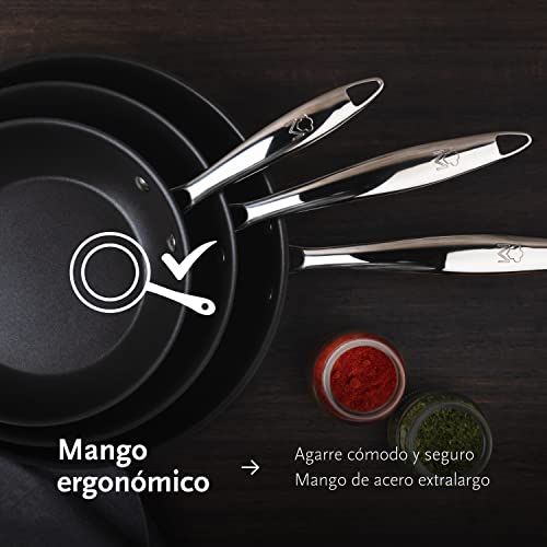 - [SUITABLE FOR INDUCTION]: Its base is suitable for all kitchens on the market. These pans are suitable for gas, halogen, electric, hob and induction cookers.