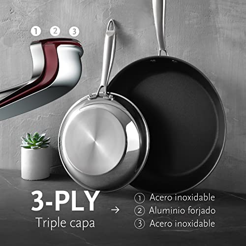 - [MAXIMUM ANTI-STICK] : These pans feature a reinforced triple clad non-stick formed by stainless steel and aluminum which maximizes the non-stick part of the parts. Hand wash recommended to extend the life of your nonstick.