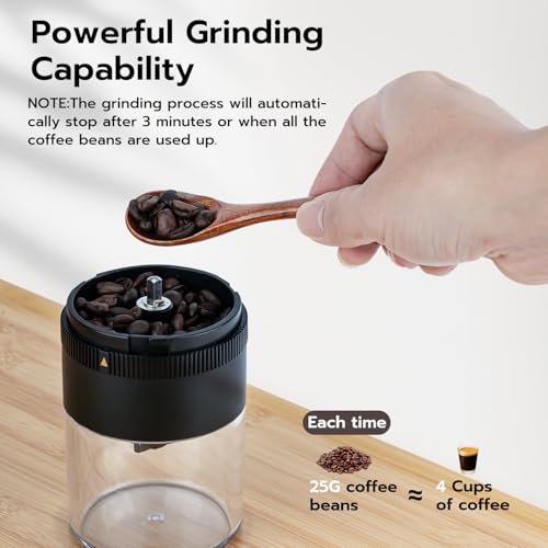 - [ Grinding Capacity: ] Support to grind up to 25g coffee bean each time (enough for 4 cups). Grinding will stop automatically after 3 min. or when there's no more coffee beans left.