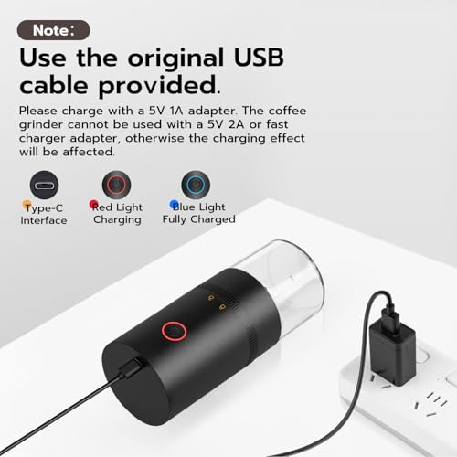 - [ IMPORTANT NOTE for Battery Maintenance:] 1). Adapter is not included in package. And it is very IMPORTANT to charge this coffee grinder by 5V 1A adapter ONLY, OR it may affect the battery lifespan, and cause the battery not work. 2). NEVER charged by any quick charge adapter. 3). NEVER over charge, stop charge after a fully charge about 3 hours. 4). Avoid battery exhausted, please charge the item full each months if longtime not use.