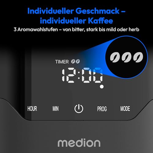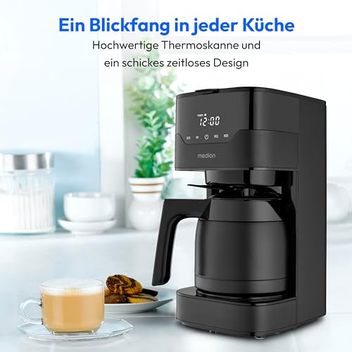 MEDION MD18458 Coffee Machine with Thermos Flask and Timer (Filter Machine, 8 Cups, 1.2 Litres, 900 Watt, 3 Levels, Keep Warm Function, Timer Switch, Anti-Drop, Display, MD18458) Matte Black