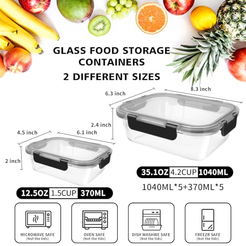 10 Pack Glass Meal Prep Containers, Airtight Glass Food Containers, Stackable Glass Food Storage Containers Set with Lids,BPA-Free, for Microwave, Oven, Freezer and Dishwasher