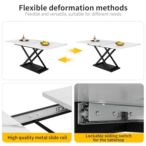 Merax Dining table 120-160×80x75cm, Extendable Kitchen Table with iron metal Legs and white MDF Desktop with marble patterns, for 6-8 People, for Home & Office, white/black