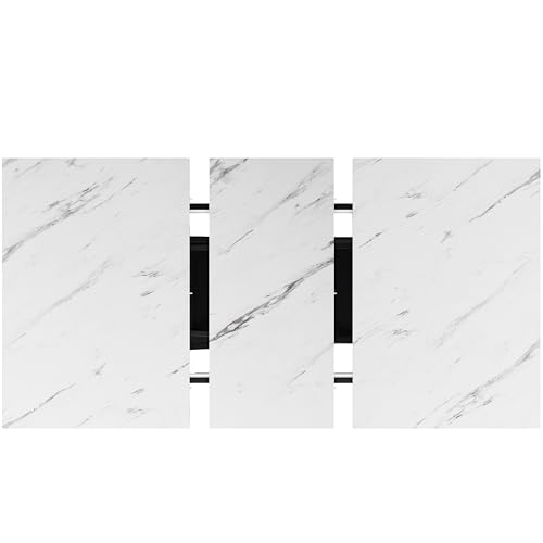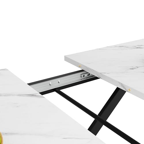 Merax Extendable Dining Table 120-160 cm – Extendable White Marble Dining Table with Crossed Black Iron Legs, Space-Saving Kitchen Table for Dining Room and Living Room