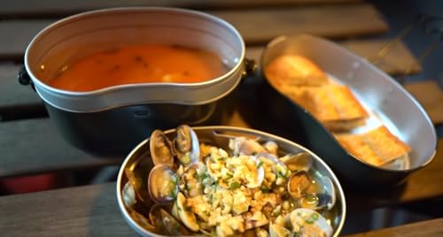 - This camping cookware set allows you to cook several dishes at once, which is very efficient. It has two layers: the bottom pot heats up to boil water or make soup, allowing steam to pass through the gap in the middle layer. The middle layer can steam rice, seafood, egg custard, steamed buns, dumplings, sweet potatoes, corn, and more. The bottom pot can also cook rice, while the upper layer can heat curry or other prepackaged dishes and be used for steaming as well.