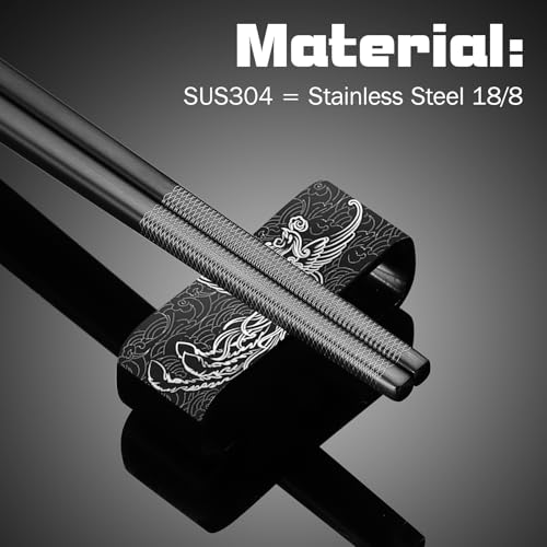 - 【Unique Laser Engraving Pattern】This set of metal chopsticks and chopstick holders features permanent laser engraved dragon and phoenix patterns. Dragons and phoenixes are both sacred symbols with unparalleled dignity, symbolizing happiness and health. The dragon and phoenix patterns are all original designs, very classic, elegant, and unique. 4 pairs of chopsticks and 4 chopstick holders to meet the needs of a family.