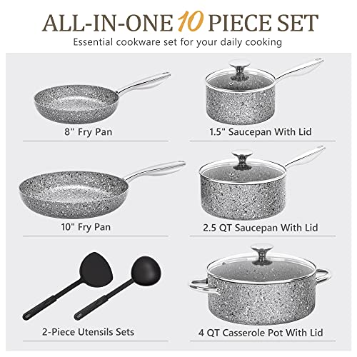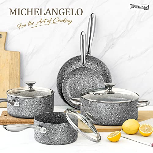 MICHELANGELO Pots and Pans Set 10 Piece, Cookware Set with Granite Coatings for Super Nonstick Result Essential Stone Cookware Set with Untinsle Set, Nonstick Cookware Set 10Pcs, Gray (HV1020166)