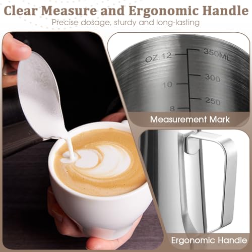 - [Measurement Markings]: The built-in measurement marks on this 350ml milk jug make it easy to achieve the perfect milk-to-coffee ratio every time, enhancing your brewing experience and elevating the quality of your coffee cup