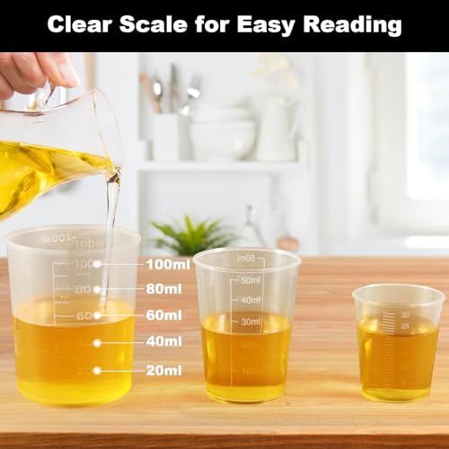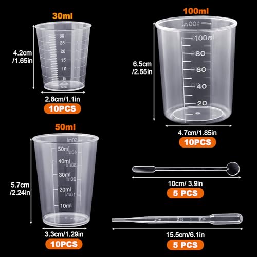 • 【Creative DIY】Clear graduated measure cups includes 10pcs 30ml measuring cups, 10pcs 50ml measuring cups, and 10pcs 100ml measuring cups, meeting various needs. It is very suitable for epoxy resin, glitter powder, paint casting art, and coatings.