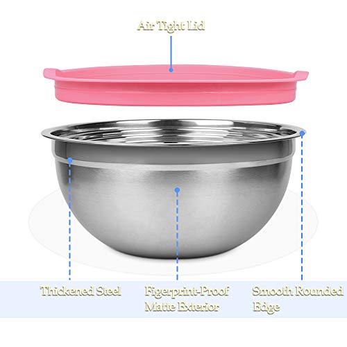 - 3.Additional Features: The flexible plastic lid fits tightly to the bowl, keeping food fresh and preventing other things from falling in. Therefore, the mixing bowl can also be used to store dry food or other objects, and is an excellent choice for storing food . Comes with spoons and whisk to meet your mixing needs.
