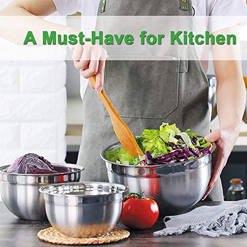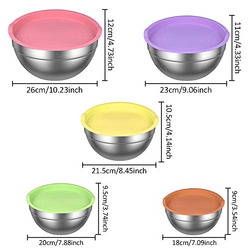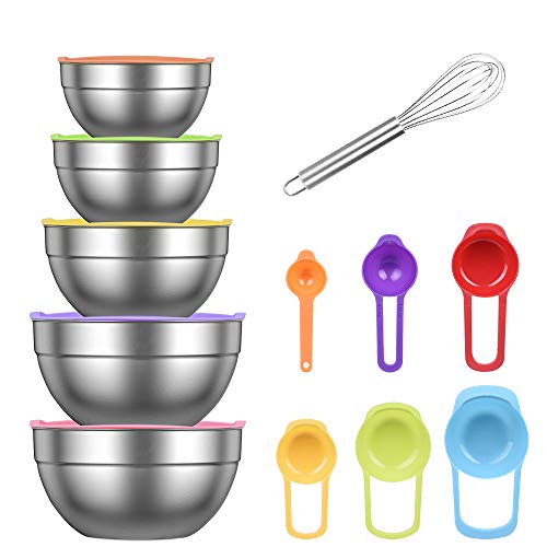 Mixing Bowl Set, Dveda 5 Pcs Stainless Steel Nesting Mixing Bowls Set, Salad Bowl with Lids for Kitchen Cooking Baking Supplies, Including 6 Pcs Measuring Spoons, 1 Pc Egg Whisk