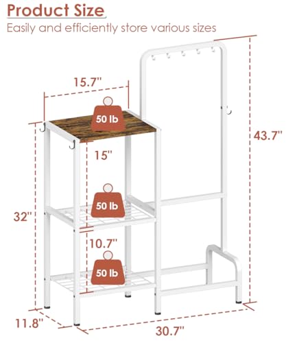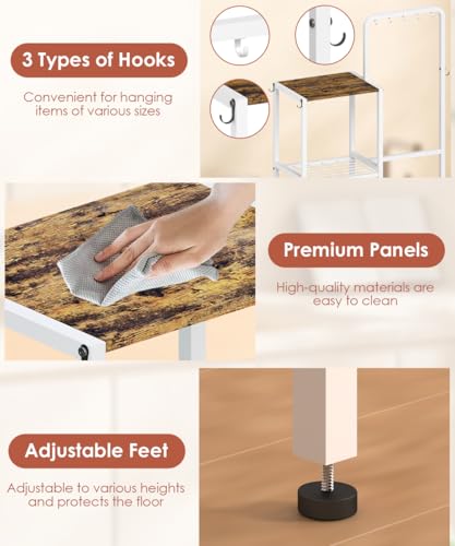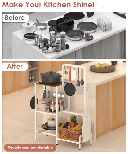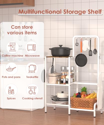 mocomax Kitchen Stand Shelf with Storage, 3-Tier Utility Baker's Rack for Spices, Adjustable Coffee Bar Station with 8 Hooks, Space-Saving Microwave Oven Stand for Pots, Pans & Utensils, White