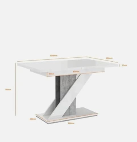 Modern Luxury Extendable Dining Table, White Glossy Finish with Industrial Concrete Base, 120-160 cm Length, Contemporary Design (White & Black)
