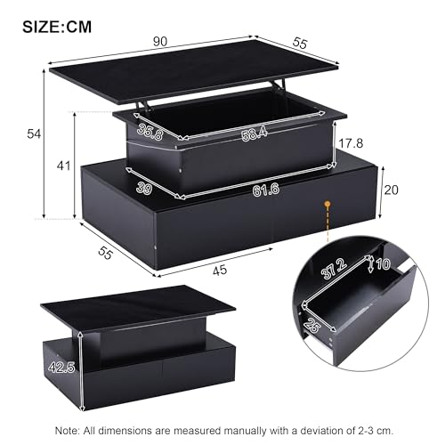 ModernLuxe LED High Gloss Lift Top Coffee Table with Storage, 1 Open Storage Space, 1 Hidden Storage Space and 4 Big Drawers, Rectangle Wooden Side Table for Living Room, Black, 90x55x42.5cm