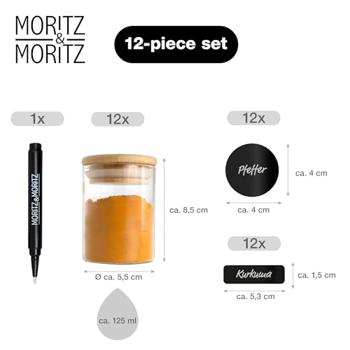 Moritz & Moritz 12x Small Spice Jars with Lids and Labels – Ø 5,5x8cm – 4.4oz/125 ml – Glass Spice Jars with Bamboo Lids with 12 x Labels and 1 x Chalk Pencil