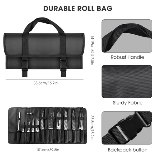 - 【Premium Design & Safety】Kitchen Knife Set features all-steel integral molding, seamless welding, not easy to break the handle. The handle is ergonomically designed to offer a comfortable grip. Each knife has individual slots and blade guards to keep them organized, You can store your entire knife collection neatly in this compact roll bag, ensuring safety protection