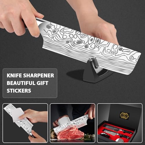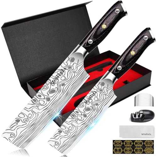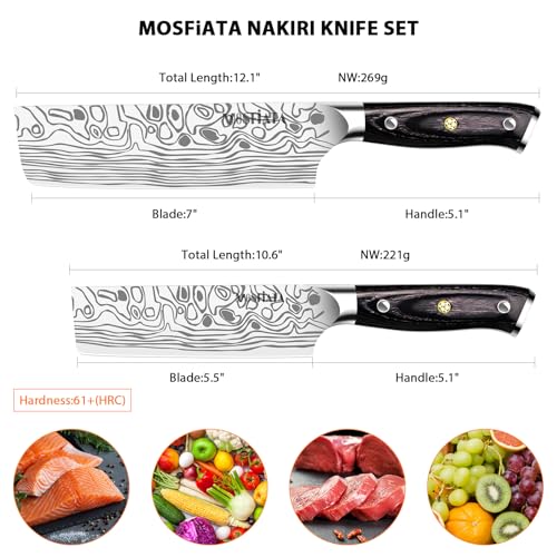 - 【Perfect Gift for Your Love】MOSFiATA Nakiri chef knife is packed in a high-quality black gift box, includes 2pcs kitchen knives, a knife sharpener, a finger guard, a cleaning cloth and custom gift stickers. It is a perfect gift for mother, father, grandparents or friends. Note: It is not Damascus steel