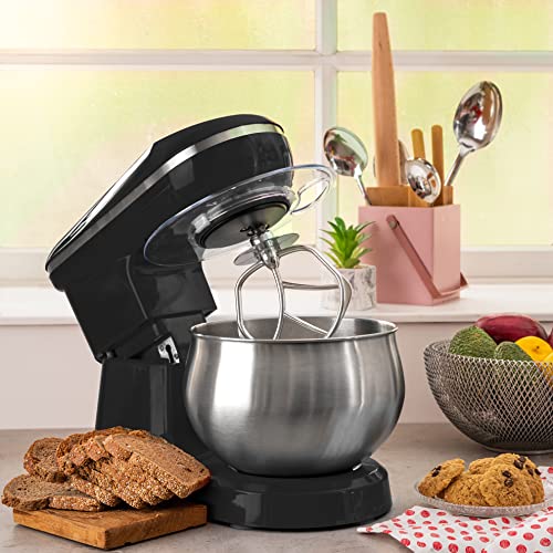 Moss & Stone Stand Mixer, 6 Speed Electric Mixer With 5.5 Quart Stainless Steel Mixing Bowl, Black Body Kitchen Mixer With Dough Hook, Egg Whisk, Beater & Baking Spatula, Classic Food Mixer