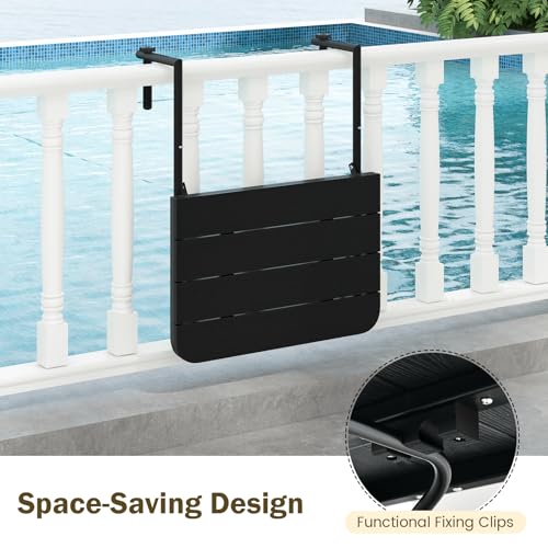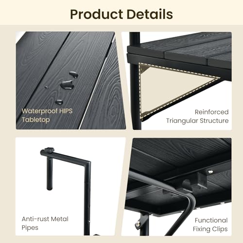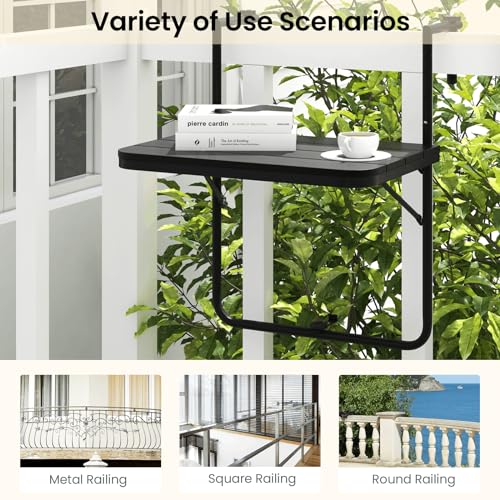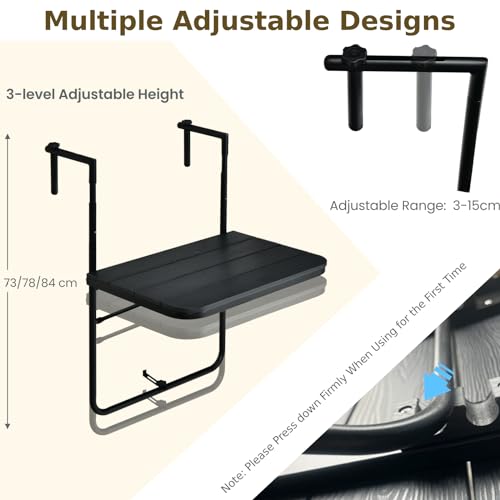 Multigot Balcony Hanging Table, Adjustable Folding Railing Side Table with Slatted Tabletop & 3 Adjustable Heights, Steel Frame Outdoor Coffee Tea Table for Balcony Garden Patio (Black)