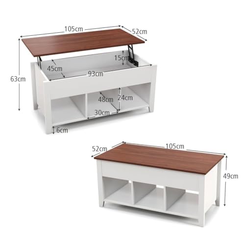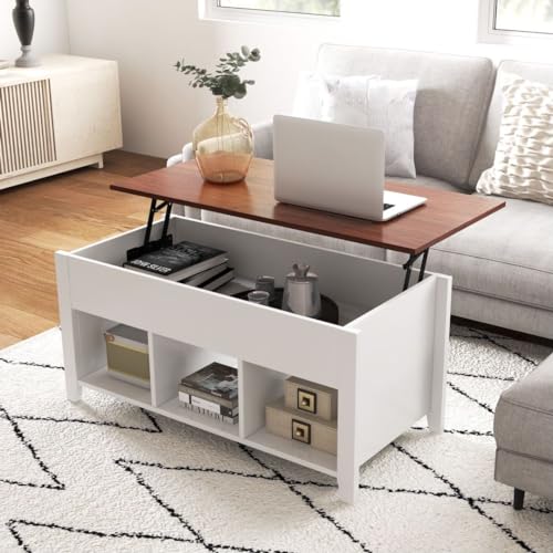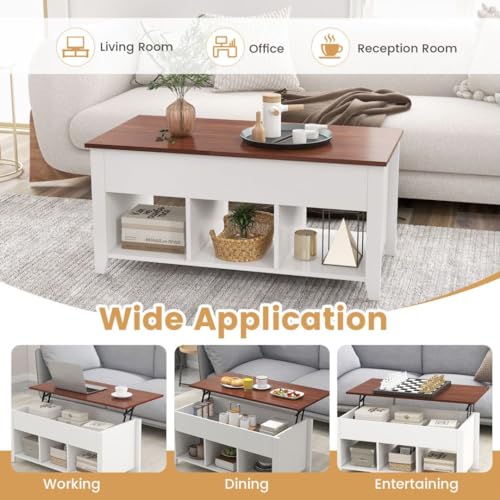 Multigot Lift Top Coffee Table, Rectangular Wooden Cocktail Center Table with Hidden Compartment & 3 Open Storage Shelves, Multifunctional Sofa Side Table for Living Room Bedroom (White + Walnut)