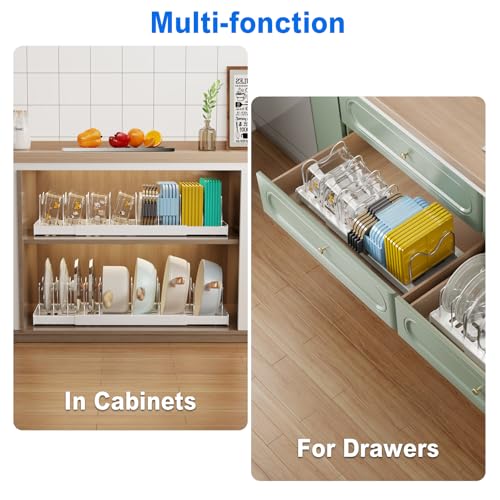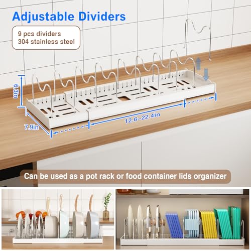 • [𝐇𝐢𝐠𝐡 𝐜𝐚𝐩𝐚𝐜𝐢𝐭𝐲] In order to maximise storage space and increase capacity, the pan rack is designed to be retractable with a minimum of 32cm and a maximum of 56cm, with 9 easy-to-install stainless steel dividers, sturdy and rust-resistant, which can be adjusted at random intervals, securely fasten items of different sizes.