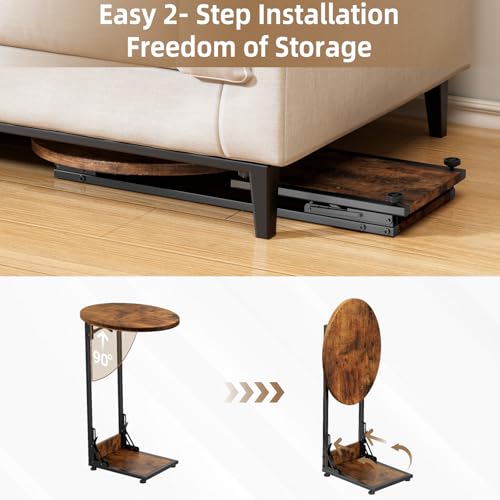 Mutool C Shaped Side Table, Foldable Round Sofa Table with Metal Frame, Small Coffee Table for Living Room Bedroom Office, Rustic Brown & Black