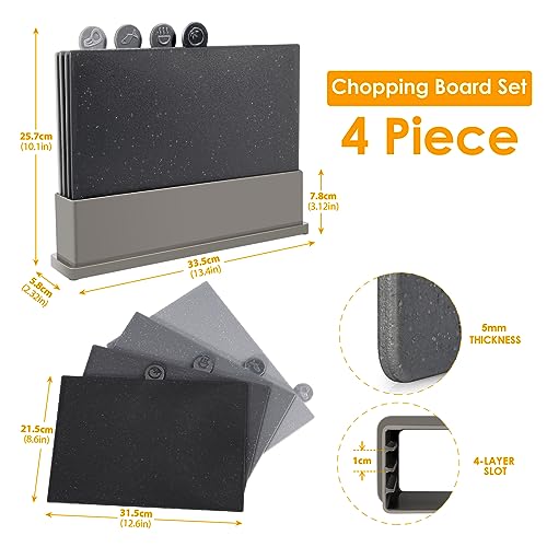 Myiosus Chopping Board Set, 4pcs Colour Coded Chopping Boards for Kitchen with Stand & Food Icons, Index Plastic Cutting Board Mats for Meat, Fruits, Vegetables, 31.5×21.5cm Black