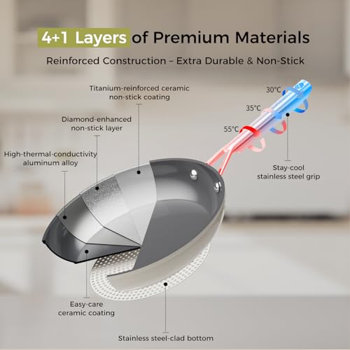 - Diamond-Titanium Coating: 5x more scratch-resistant coating, reinforced for exceptional durability and safe for metal utensils.