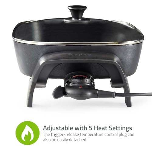 • ADJUSTABLE TEMPERATURE – The skillet pan features an adjustable temperature, with 5 different heat settings (150-230°C) that can be adjusted quickly. This means you can ensure your food is cooked perfectly through, without the risk of burning your dinner or leaving it undercooked. The trigger-release temperature control plug can also be easily detached, ready for when you need to clean the pan.